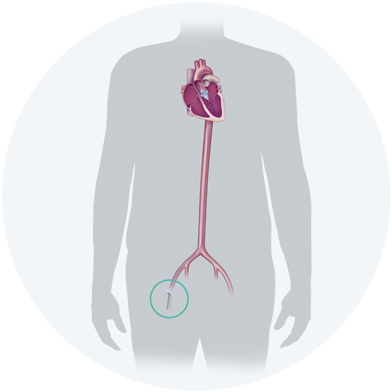 Die TAVI kann mit verschiedenen Zugängen durchgeführt werden, aber der häufigste Zugang erfolgt durch einen kleinen Schnitt in der Leiste. Dies wird als transfemoraler Zugang bezeichnet.4,8 Das Herzteam wird auf der Grundlage Ihrer individuellen Anatomie die beste Stelle für den Schnitt bestimmen.